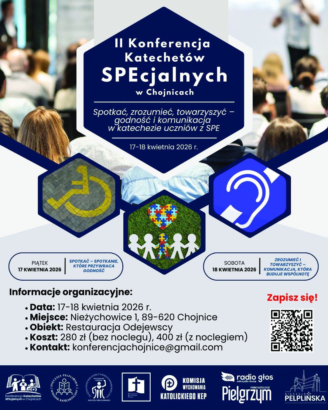 Katecheci specjalni z Chojnic, we współpracy z Wydziałem Katechetycznym oraz Duszpasterstwem Osób z Niepełnosprawnościami Diecezji Pelplińskiej, zapraszają do udziału w II Konferencji Katechetów SPEcjalnych w Chojnicach, która odbędzie się w dniach 17-18 kwietnia 2026 r.