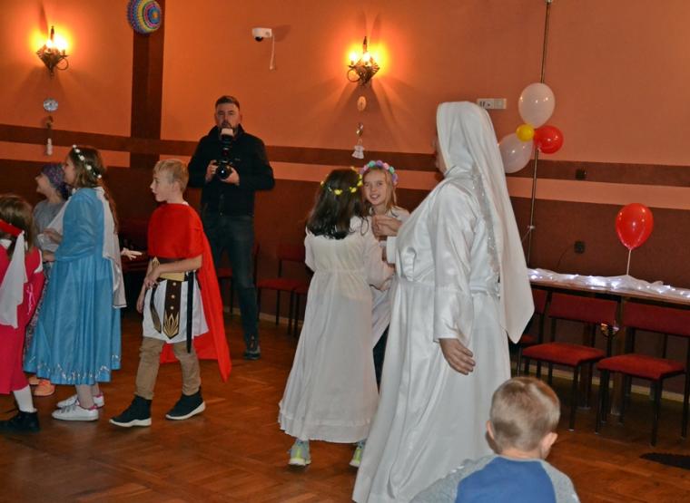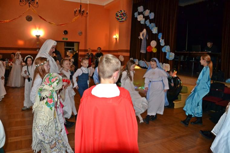 Za jakich Świętych przebrały się dzieci? Najliczniejszą grupę stanowiły Aniołki. Była na balu Maryja, były święte siostry zakonne, a wśród nich Apostołka Bożego Miłosierdzia Faustyna. Nie zabrakło na tym niezwykłym balu św. Jana Pawła II. Na mikstackim Balu Wszystkich Świętych bawiły się m.in. św. Zofia, Jadwiga, Cecylia, Marta, Matka Teresa z Kalkuty, św. Rozalia,  ale także dzieci fatimskie. Nie zabrakło Kacpra, Melchiora, Baltazara,. Dobrze bawił się na balu św. Marcin i św. Hubert. Wszystkich Świętych uczestników mikstackiego trudno wymienić.  W MGOK-u rozbrzmiewały dźwięki muzyki, przy której świetnie bawili  się wszyscy uczestnicy balu, bo przecież  Święci to ludzi uśmiechnięci …