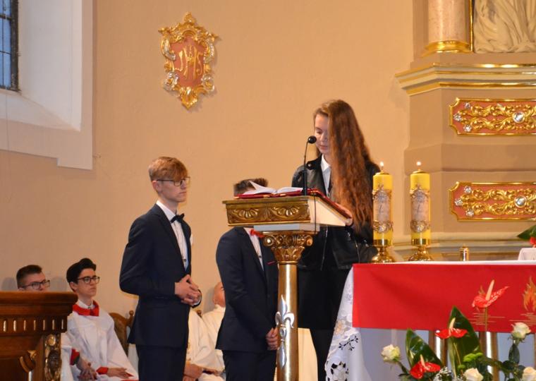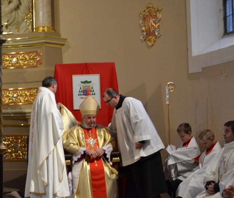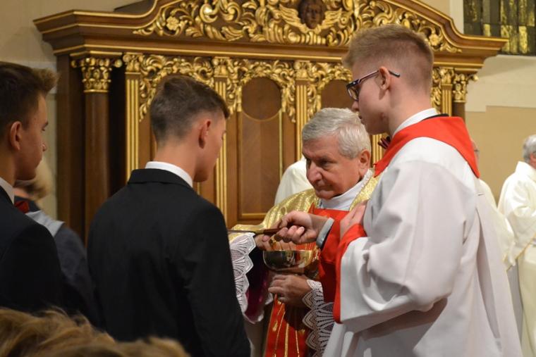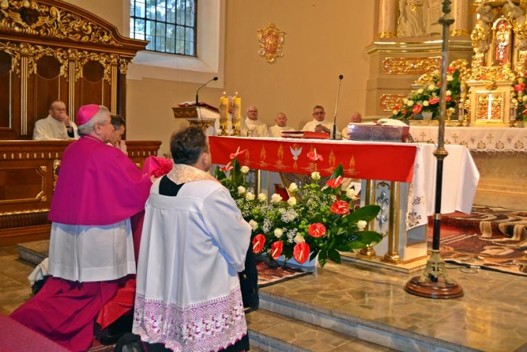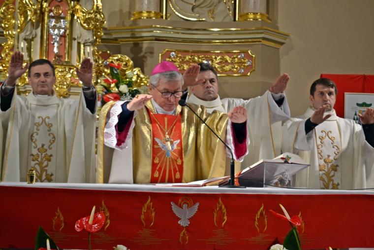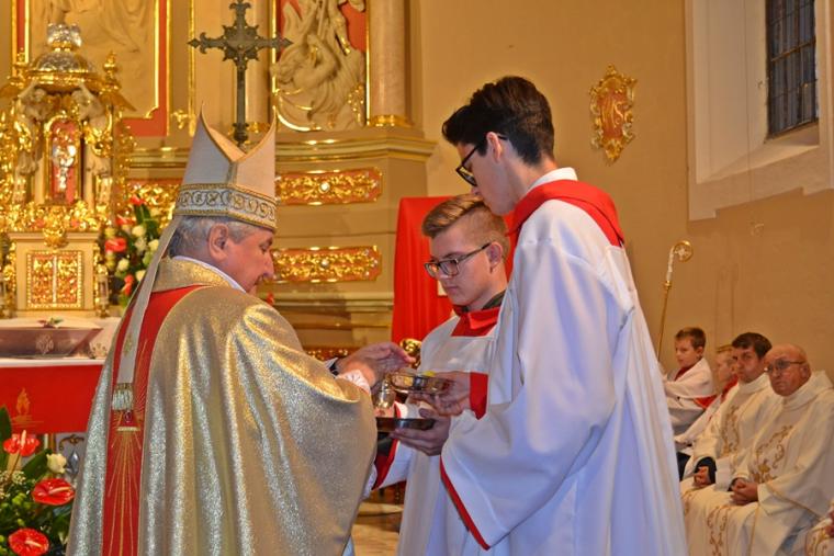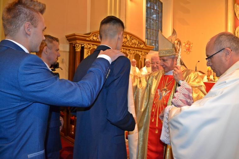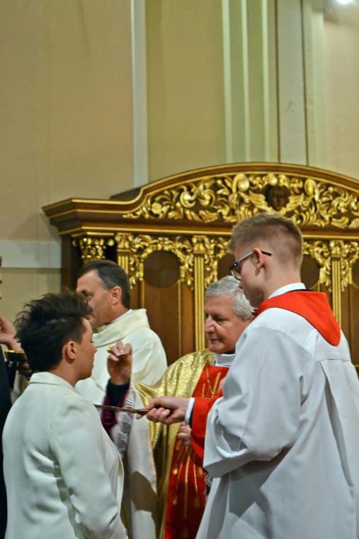 Następnie Ks. Bp wraz z kapłanami w geście wyciągniętych rąk modlił  się o dary Ducha Świętego dla przyjmujących Sakrament Bierzmowania. Po zakończonej modlitwie miało miejsce namaszczenie czoła olejem Krzyżma Świętego, któremu towarzyszą słowa formuły sakramentalnej: „Przyjmij znamię daru Ducha Świętego”. Nie zabrakło oczywiście podziękowań młodzieży skierowanych do ks. bpa Ordynariusza za udzielenie im sakramentu bierzmowania mającego umocnić ich na do mężnego wyznawania wiary. Były też słowa podziękowania dla kapłanów i rodziców.
