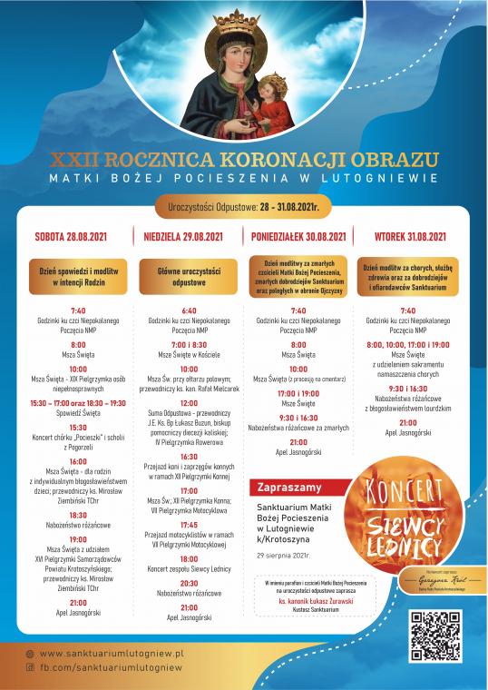 Słowa pieśni zespołu „Świecy Lednicy” , są takim idealnym zaproszeniem na tegoroczne Uroczystości Odpustowe ku czci Matki Bożej Pocieszenia. Właśnie na zakończenie wakacyjnych dni wszystkie drogi prowadzą do Sanktuarium Matki Bożej Pocieszenia w Lutogniewie, w diecezji kaliskiej. Na Uroczystości Odpustowe ku czci Matki Bożej Pocieszenia, które odbędą się w dniach 28. 08 ~ 31. 08., już dzisiaj w imieniu parafian i czcicieli Matki Bożej Pocieszenia, zaprasza ks. kan. Łukasz Żurawski Kustosz Sanktuarium Każdy dzień będzie wypełniony przede wszystkim wspólną modlitwą, podczas której spoglądając w oczy Matki Bożej będziemy mogli powierzyć Jej zarówno swoje troski jak i podzielić się radościami. Podczas Uroczystości Odpustowych ku czci Matki Bożej Pocieszenia czeka na Państwa wiele atrakcji. W sobotnie popołudnie, będzie można wysłuchać koncertu chórku „Pocieszki” i scholii z Pogorzeli. Natomiast w niedzielny wieczór, z pewnością wiele radości dostarczy nam koncert zespołu „Siewcy Lednicy”.