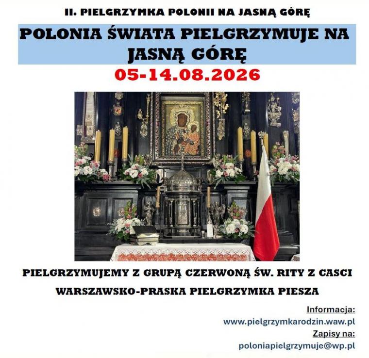 Wędrować będziemy wraz z Pieszą Pielgrzymką Rodzin Diecezji Warszawsko-Praskiej, jako podgrupa Czerwonej Grupy św. Rity. Duchowość tej świętej będzie nam szczególnie towarzyszyć podczas drogi – w pielgrzymce niesione są również relikwie św. Rity. Naszym pragnieniem jest, aby w przyszłości powstała niezależna Biało-Czerwona grupa Polonii.